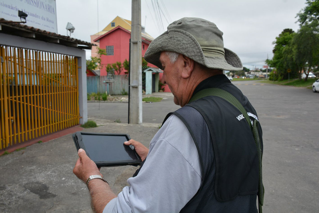 Os agentes de endemias de Pinhais estão realizando o trabalho de campo com o auxílio de tablets para cadastrar as informações. Há alguns anos, desde 2014, os aparelhos portáteis são usados no lugar da folha de papel e da prancheta.