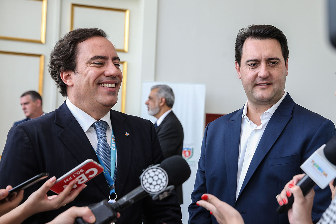 O governador Carlos Massa Ratinho Junior e o presidente da Caixa Econômica Federal, Pedro Guimarães, discutiram, na segunda-feira, dia 28, a possibilidade do Paraná acessar uma linha de crédito para investimentos em saneamento, infraestrutura e desenvolvimento urbano.