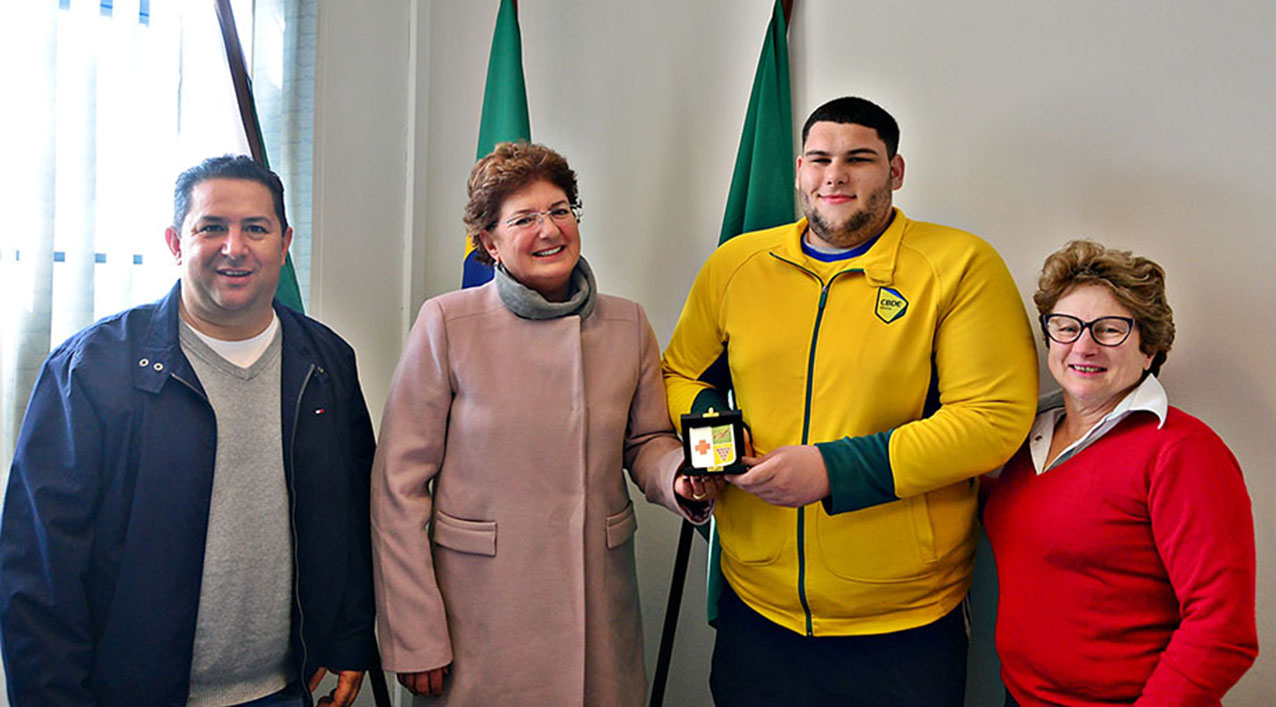 A Prefeita Beti Pavin, acompanhada do Secretário de Esporte, Cultura, Lazer e Juventude, Paulo César Cardoso, entregou na tarde de quarta-feira, dia 6, uma placa de homenagem ao atleta que, mesmo morando em outro estado, não esquece de sua cidade natal.