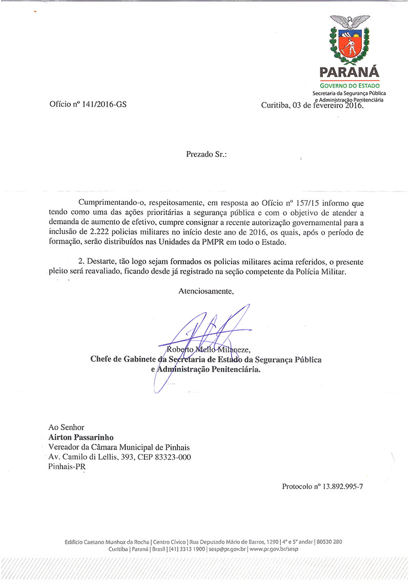 Em resposta a reunião realizada com o Excelentíssimo Senhor Wagner Mesquita, Secretário de Segurança Pública do Paraná, foi encaminhado ao gabinete do vereador Passarinho um ofício explicando as diretrizes para a contratação de novos policiais militares para o Paraná. “Na ocasião, fomos atendidos pelo secretário e pudemos reivindicar melhorias na Segurança Pública da nossa cidade, como o aumento do efetivo policial militar, mais viaturas e Delegado”, destacou Passarinho.