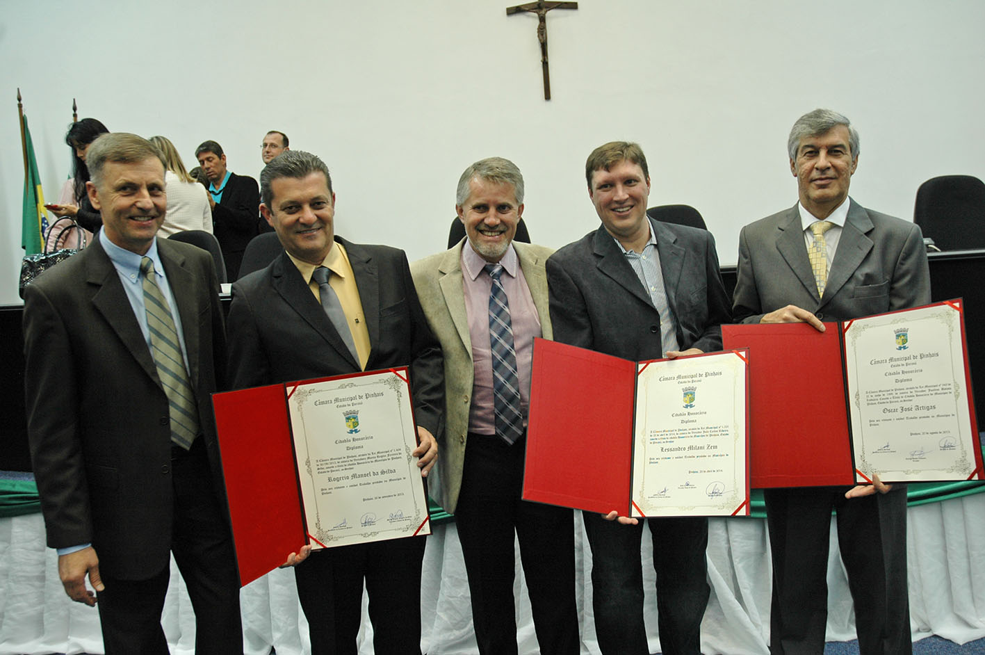 O Presidente da Casa, Vereador Gilberto Hartkpof, afirmou que mais uma vez a Câmara cumpriu o seu papel. Segundo o parlamentar, estes são grandes empresários, parceiros da Câmara e da Prefeitura, bem como da população de Pinhais, e mereciam tal homenagem. “Estes três senhores nos honram muito por este momento, em que cumprimos mais uma vez nosso papel, por se tratar de pessoas que fazem a diferença, não apenas como empresários, mas também participando da vida social do Município, seja na geração de empregos, como também no auxílio a projetos sociais”, lembrou Gilberto.
