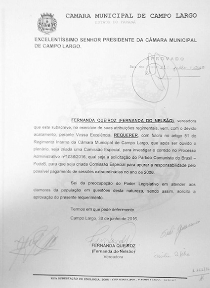 Na edição número 144, de 26 de julho, na página 9, publicamos matéria com o título “Câmara de Campo Largo abre investigação contra pré-candidato a prefeito da cidade”. Na referida matéria citamos as vereadoras Fernanda do Nelsão, Cléa Oliveira e Sueli Guarnieri como autoras do requerimento que pediu a abertura de uma Comissão Especial de Investigação(CEI) contra o ex-presidente da Câmara(2006) Marcelo Puppi, atual pré-candidato a prefeito de Campo Largo. No entanto, a vereadora Cléa Oliveira nos mandou e-mail dizendo que a autora do requerimento foi apenas a vereadora Fernanda do Nelsão, e que ela apenas assinou o documento para que este entrasse para votação.