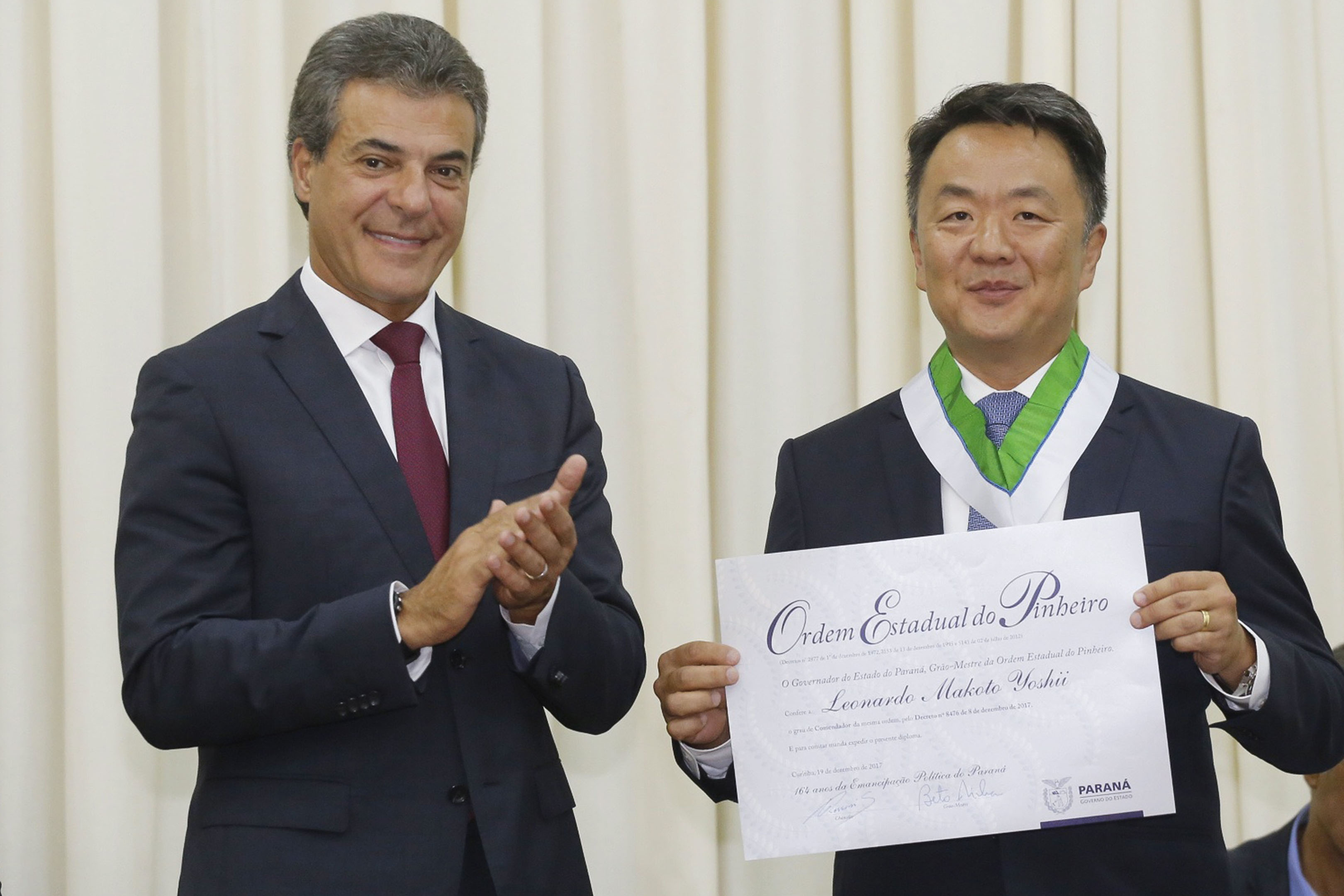 Os japoneses deram contribuições inestimáveis para a edificação do Paraná. A afirmação foi feita pelo Governador Beto Richa durante encontro com a comunidade nipo-brasileira na Associação Cultural Brasil-Japão do Paraná, em Londrina. No encontro, o Governador entregou a Comenda da Ordem do Pinheiro do Paraná ao empresário Leonardo Makoto Yoshii. Trata-se da maior honraria do Estado.