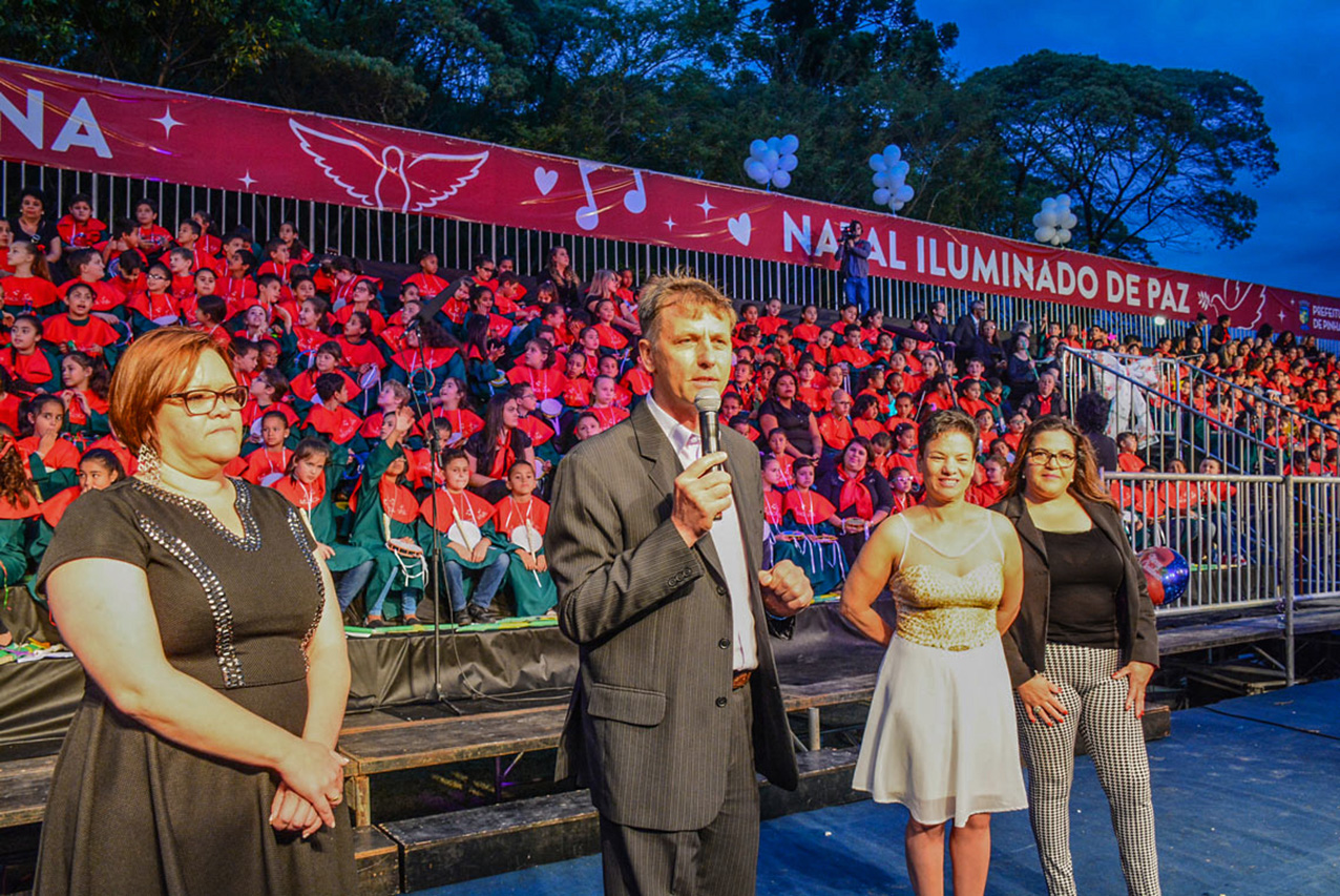 Luizão Goulart saudou inicialmente às crianças do Coral, exaltando o preparo e dedicação durante o ano para fazerem bonito durante a Cantata. O Prefeito ainda enfatizou o momento de gratidão que a época do ano e a festividade representam. “Agradecemos primeiramente a Deus, por este momento e pela boa administração realizada em Pinhais. Tenho muito orgulho de encerrar essa gestão com a certeza de ter feito o melhor, junto com a Marli Paulino e toda equipe de secretários e servidores”, frisou. Luizão também ressaltou o ano de desafios que será 2017, a partir da gestão da Prefeita eleita, Marli Paulino, e da Vice-Prefeita eleita, Rosa Maria. “Ano que vem será mais difícil, em decorrência da crise econômica. Porém, temos a satisfação de finalizar o mandato com as contas em dia. Muitos me perguntam como tem dado certo aqui em Pinhais, apesar da crise. Respondo que temos uma equipe competente, dedicada, que, com muito empenho e preparo, faz o melhor, agindo sempre com muita responsabilidade e seriedade. Uma coisa é certa. Quem semeia intriga, colherá intrigas. Mas quem semeia paz, colherá paz. Estamos aqui, hoje, para cantar a paz, louvar a Deus, agradecer por esse momento e pelo ano que termina”, acrescentou.