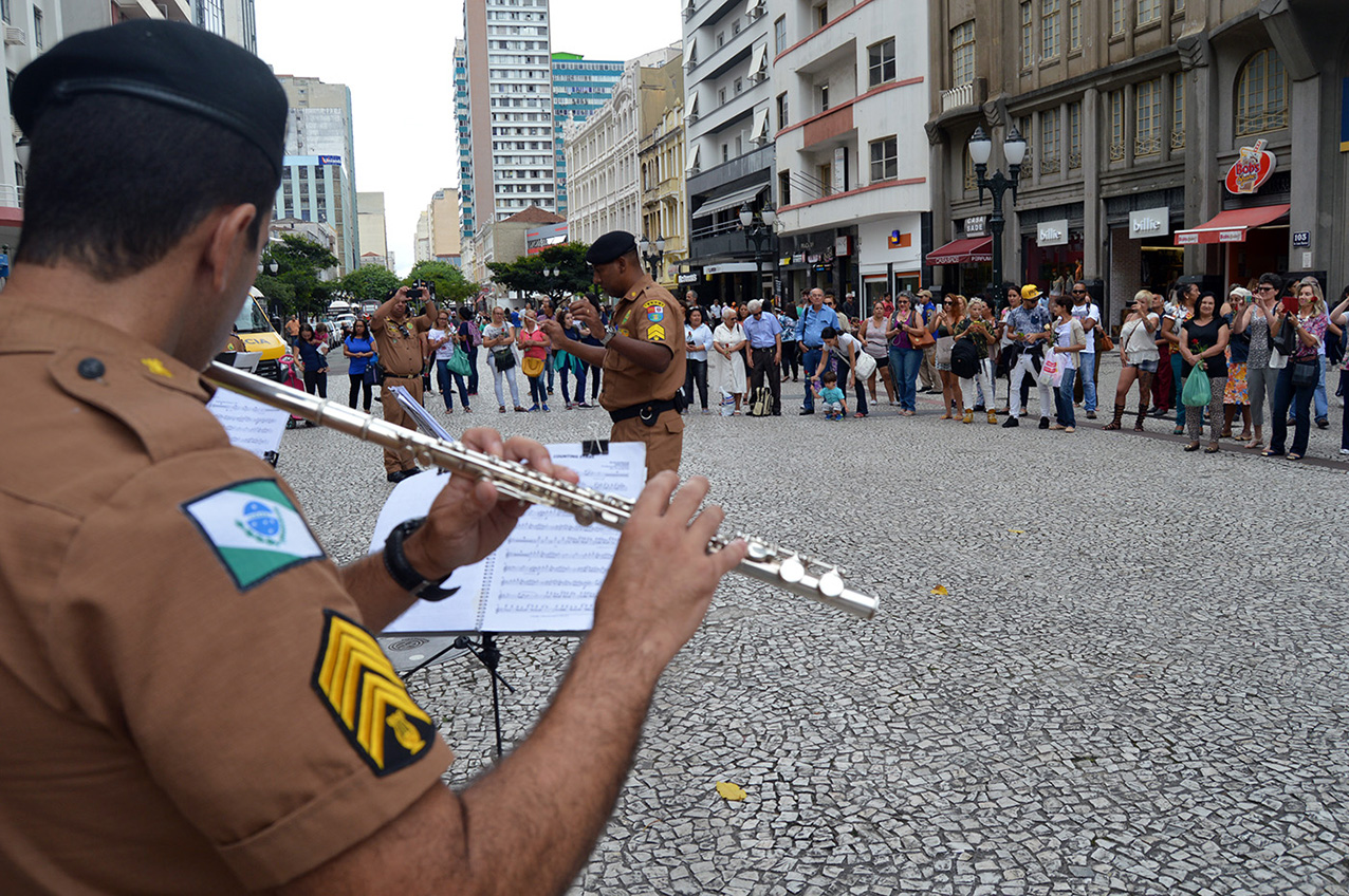 A Polícia Militar do Paraná preparou um espetáculo para todas as mulheres na manhã de quarta-feira (08/03) na Boca Maldita, no centro de Curitiba, a fim de ho menageá-las pelo Dia Internacional da Mulher. A Banda de Música da PM preparou um repertório especial de canções e, durante a apresentação, policiais militares entregaram mais de 200 rosas para quem passava pela Rua XV.