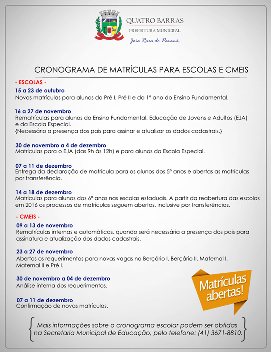 A Secretaria Municipal de Educação de Quatro Barras abriu o calendário de matrículas para o ano letivo de 2016, para escolas municipais, escola especial e Centros Municipais de Educação Infantil (Cmeis).