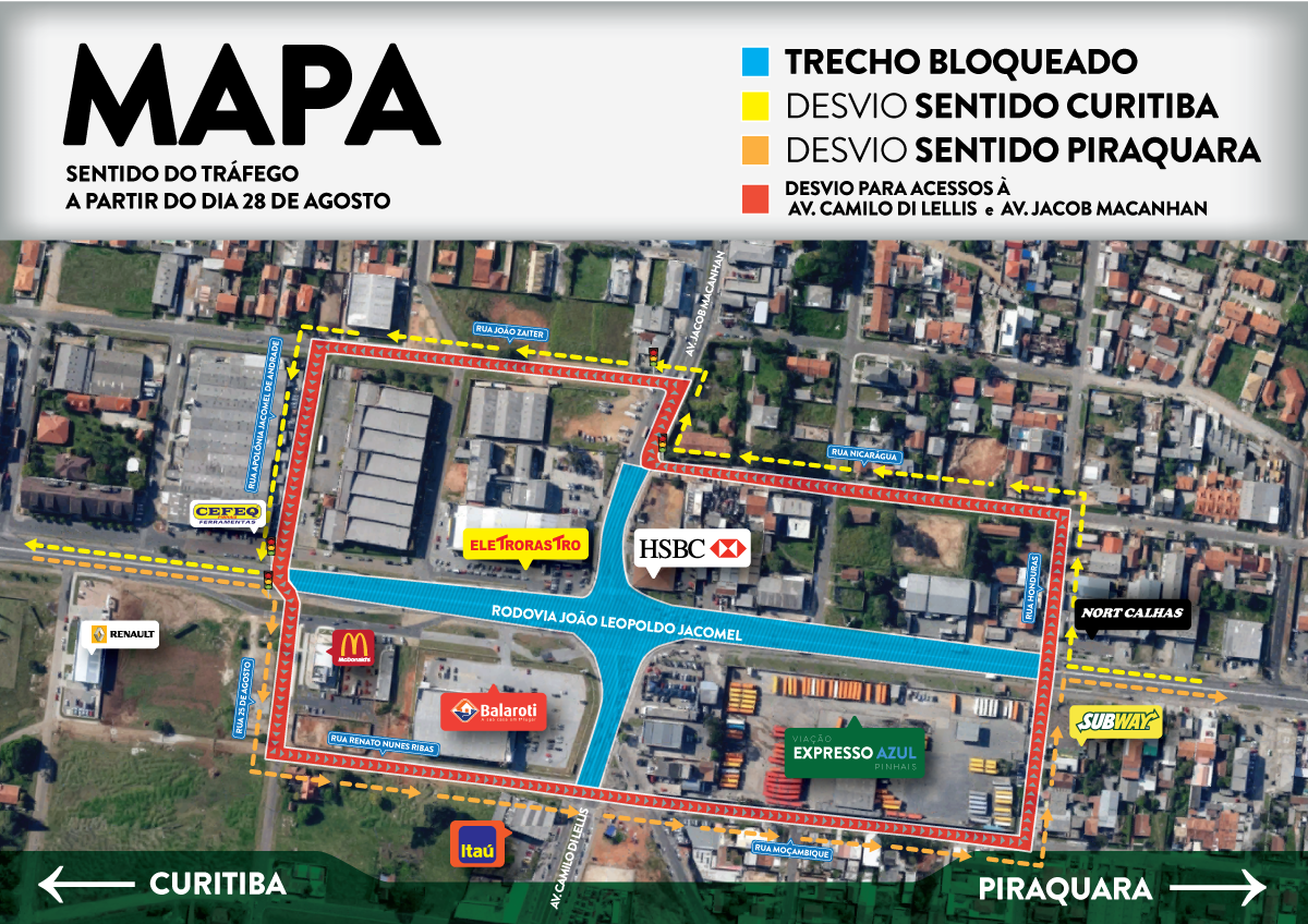O Departamento de Estradas de Rodagem do Paraná (DER-PR) inicia as obras de construção da trincheira na rodovia João Leopoldo Jacomel e, com isso, será interditado o cruzamento com a avenida Jacob Macanhan, em Pinhais.