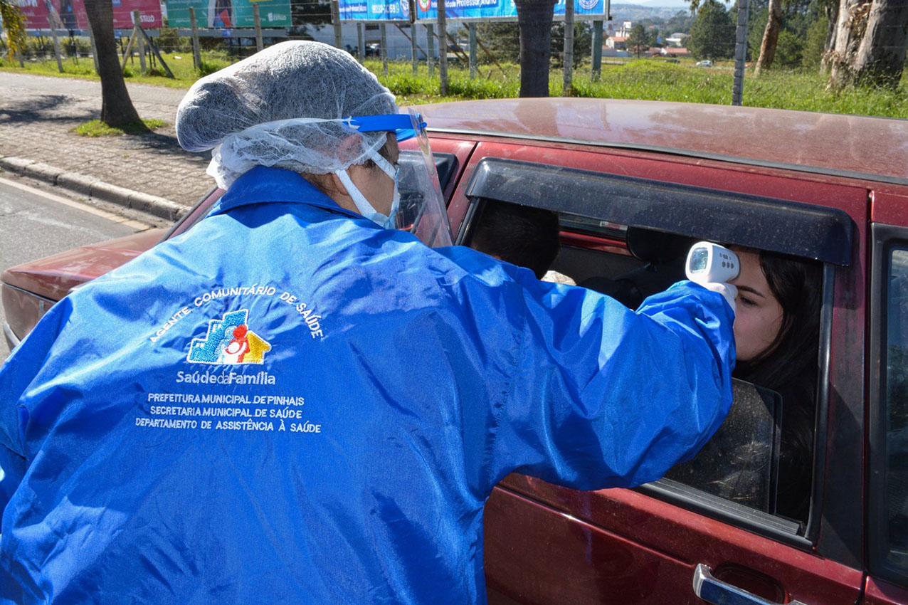 Durante as blitze, as agentes comunitárias de Saúde fazem a aferição da temperatura dos motoristas e passageiros e os guardas entregam o material “Pinhais contra o Coronavírus”, além de darem informações educativas e orientações ao público.