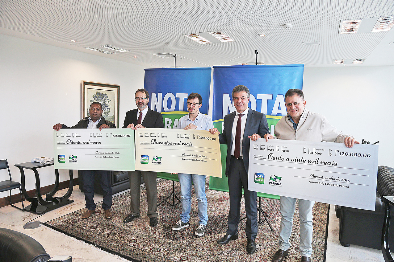 O Governador Beto Richa e o secretário da Fazenda em exercício, George Tormin, entregaram os cheques aos ganhadores na sexta-feira (23), em solenidade no Palácio Iguaçu, em Curitiba. Richa ressaltou que o Nota Paraná se consolidou como um grande programa e já distribuiu mais de meio bilhão de reais em prêmios e créditos aos contribuintes.