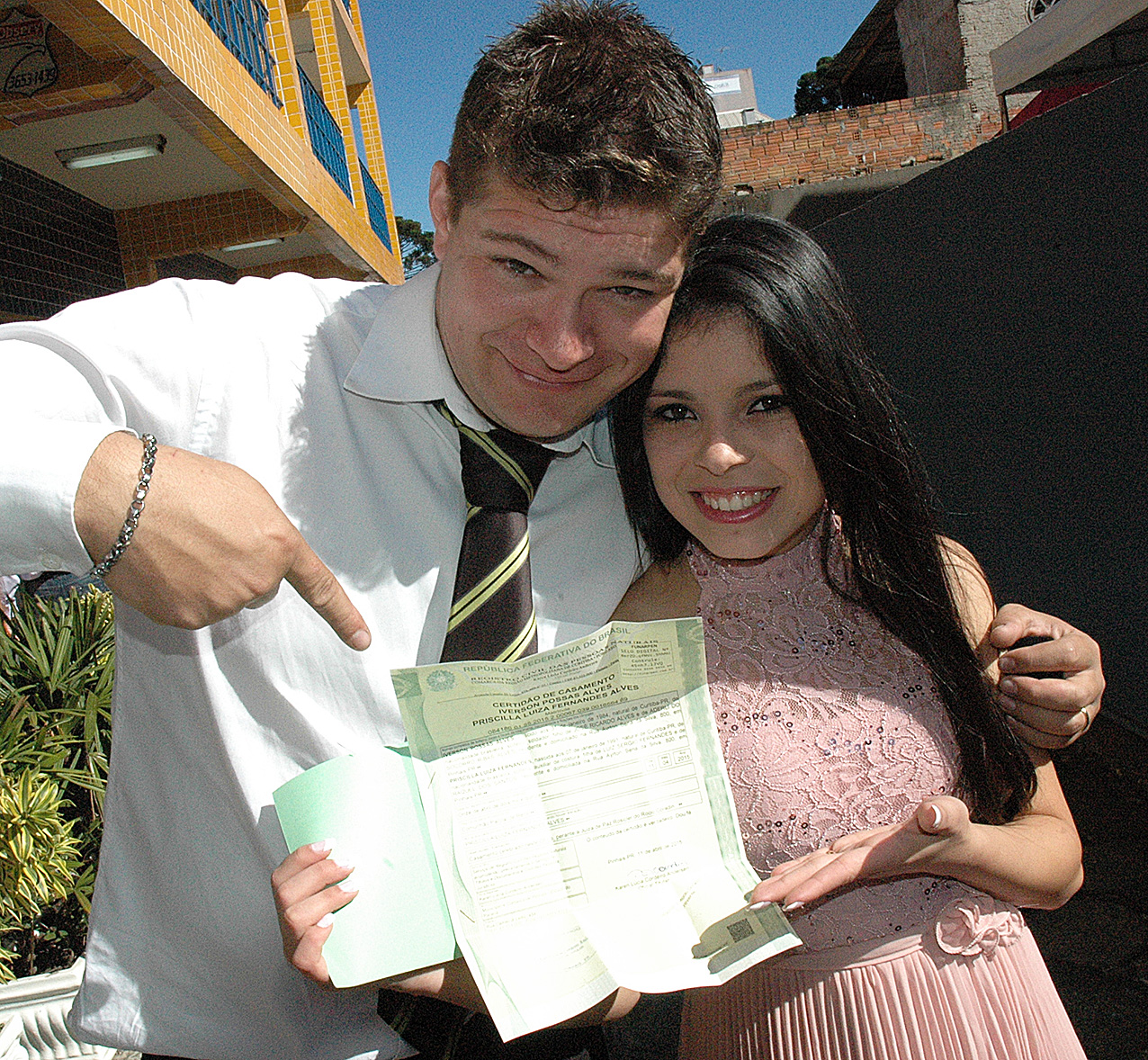 Na manhã deste dia, estiveram no cartório e fizeram os votos de compromisso perante a lei. Já no final da tarde, recepcionaram os familiares e amigos com uma grande festa. Entre os padrinhos estavam os amigos do teatro.