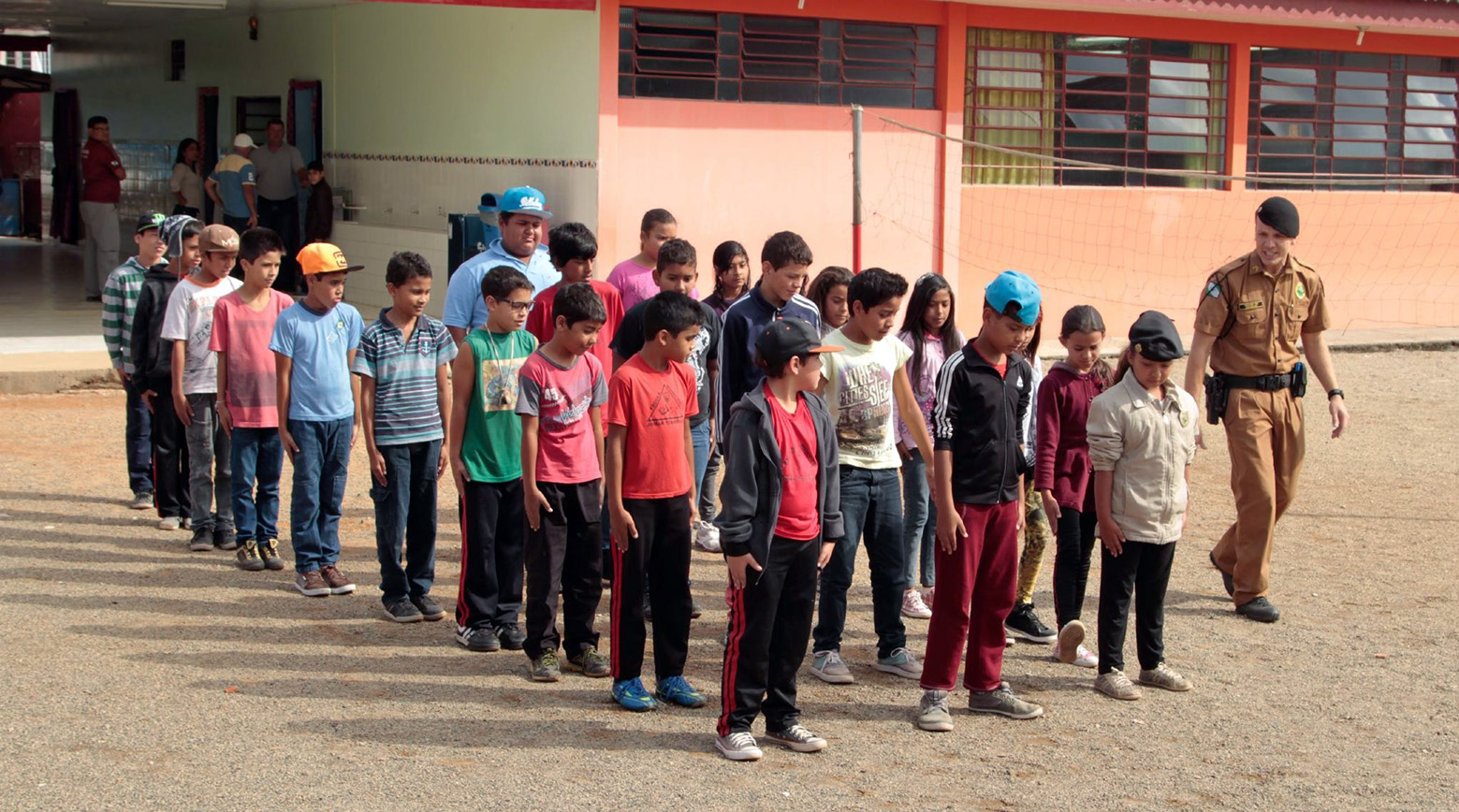 O soldado Guilherme (BPEC), que ministra aulas para os alunos de Piraquara, explica que o PROERD tem como objetivo principal ensinar formas de as crianças dizerem não às drogas. A metodologia conta com dez encontros, um por semana.