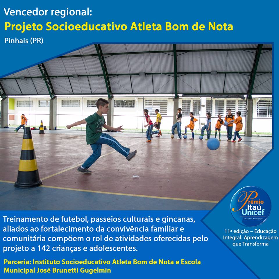 A Escola Municipal José Brunetti Gugelmin e o Projeto Socioeducativo Atleta Bom de Nota receberam o prêmio regional da 11ª Edição do Prêmio Itaú-Unicef, com a temática Educação Integral: Aprendizagem que transforma. Nesta etapa, as entidades foram escolhidas entre outros 160 projetos.