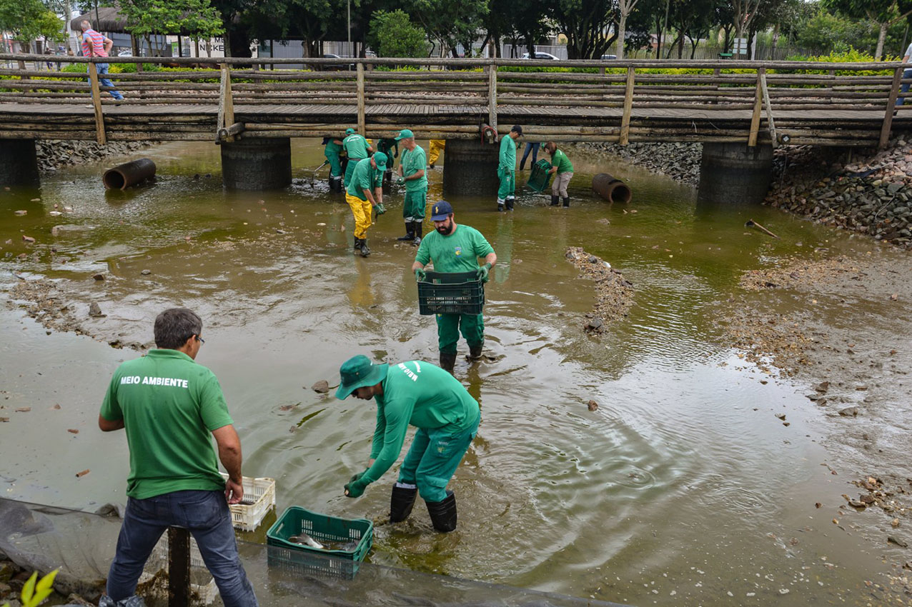 Na segunda-feira, dia 3, a Prefeitura de Pinhais, por meio da Secretaria Municipal de Meio Ambiente (Semma), realizou a limpeza do lago no Bosque Municipal. Esta manutenção acontece sempre que necessário e tem por objetivo, além da limpeza do acúmulo de segmentos gerados ao longo do tempo, conter a superpopulação de peixes.